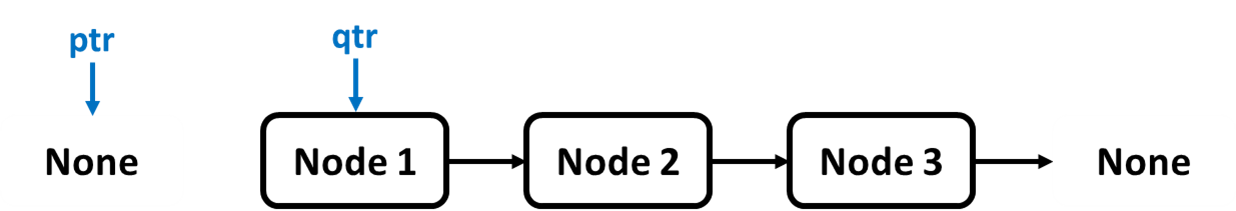 • 首先設定起始點 ptr 指向 Noneqtr 指向 Node 1 (如圖)